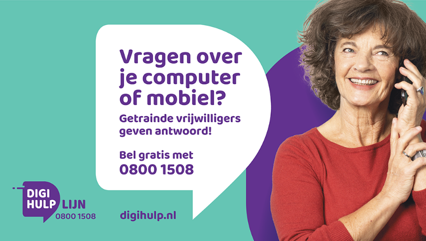 De Digihulplijn is uw vraagbaak voor alle vragen over de digitale wereld. Een professioneel team zit klaar om uw vragen te beantwoorden, elke dag van 9 tot 17 uur. Bel gratis via 0800 1508 (u betaalt alleen de kosten van uw telefoonaanbieder).