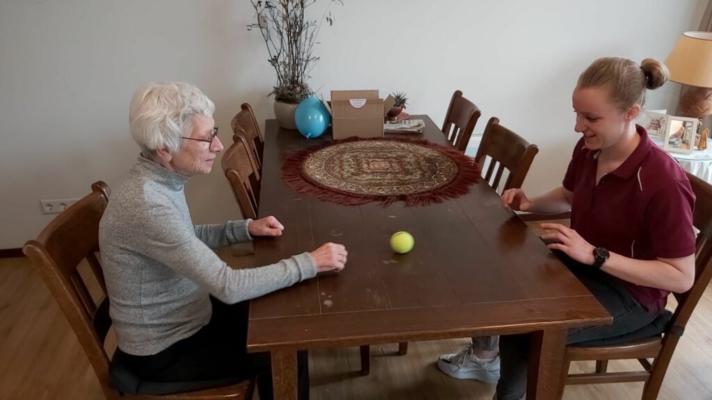 Amy bedacht beweegdoosjes voor de beweegvisite: wanneer je het doosje opent, vind je als eerste een flyer. Op die flyer staan vier foto’s met daaronder een QR-code. Wanneer je die scant, krijg je de filmpjes van de oefening te zien die bij de foto hoort. Maar ook zonder het scannen van de QR-code is het mogelijk de oefening te doen, omdat de foto ook uitbeeldt wat de oefening is. De rest van het doosje bestaat uit een tennisbal, pingpongbal, stuiterbal, een ballon, een stuk touw en 5 krantenpagina’s. “Op de pingpongballen staat een lachende smiley. Die heeft een bewoner op alle 230 pingpongballen getekend.” Het stuk touw en de krantenpagina’s zijn bedoeld om een soort volleybalnet van te maken, om daar vervolgens met de ballon overheen te spelen.