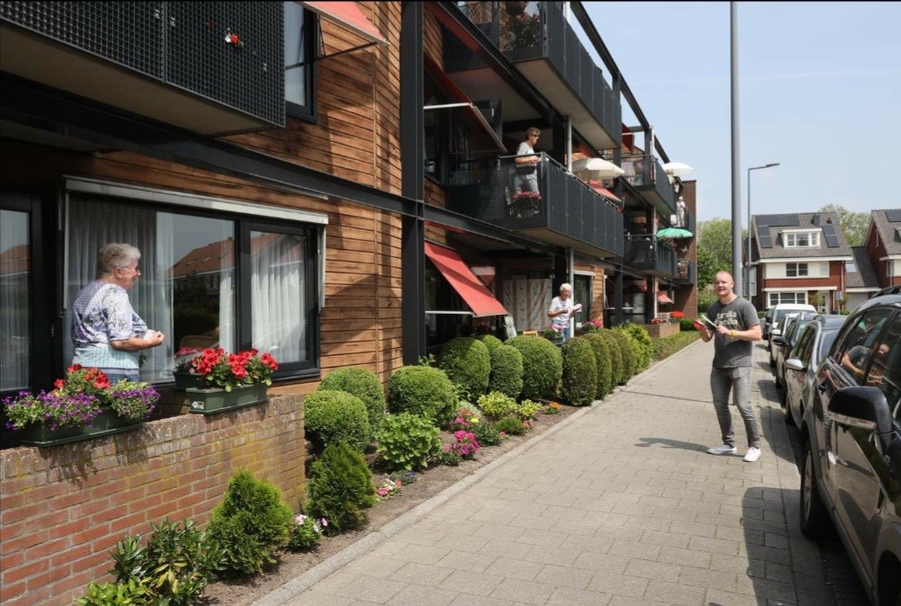 Babet Blom, seniorencoach bij WMO Radar, heeft samen met haar collega’s Balkon Beweegdag aangegrepen om groot uit te pakken voor ouderen. “In coronatijd zie je dat veel ouderen het hoofd laten hangen. We hebben nu eindelijk weer iets te doen. Vrolijkheid en bewegen, die combinatie daar worden wij heel blij van.”
