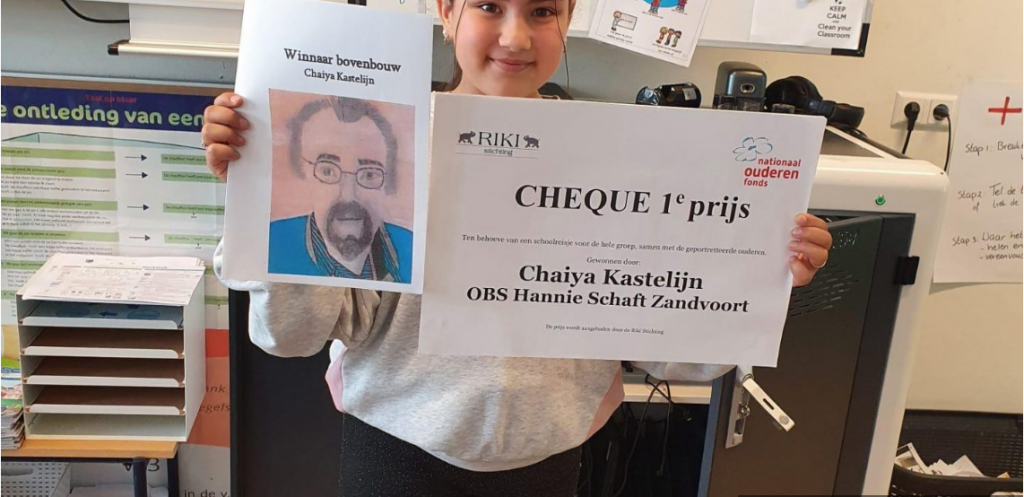 Het Ouderenfonds organiseerde in 2020 samen met de Riki Stichting voor de tiende keer ‘Jongeren Portretteren Ouderen’ (JPO). Blij verrast hoorde Chaiya Kastelijn, uit groep 7 van OBS Hannie Schaft, dat ze de eerste prijs heeft gewonnen met het door haar gemaakte portret.