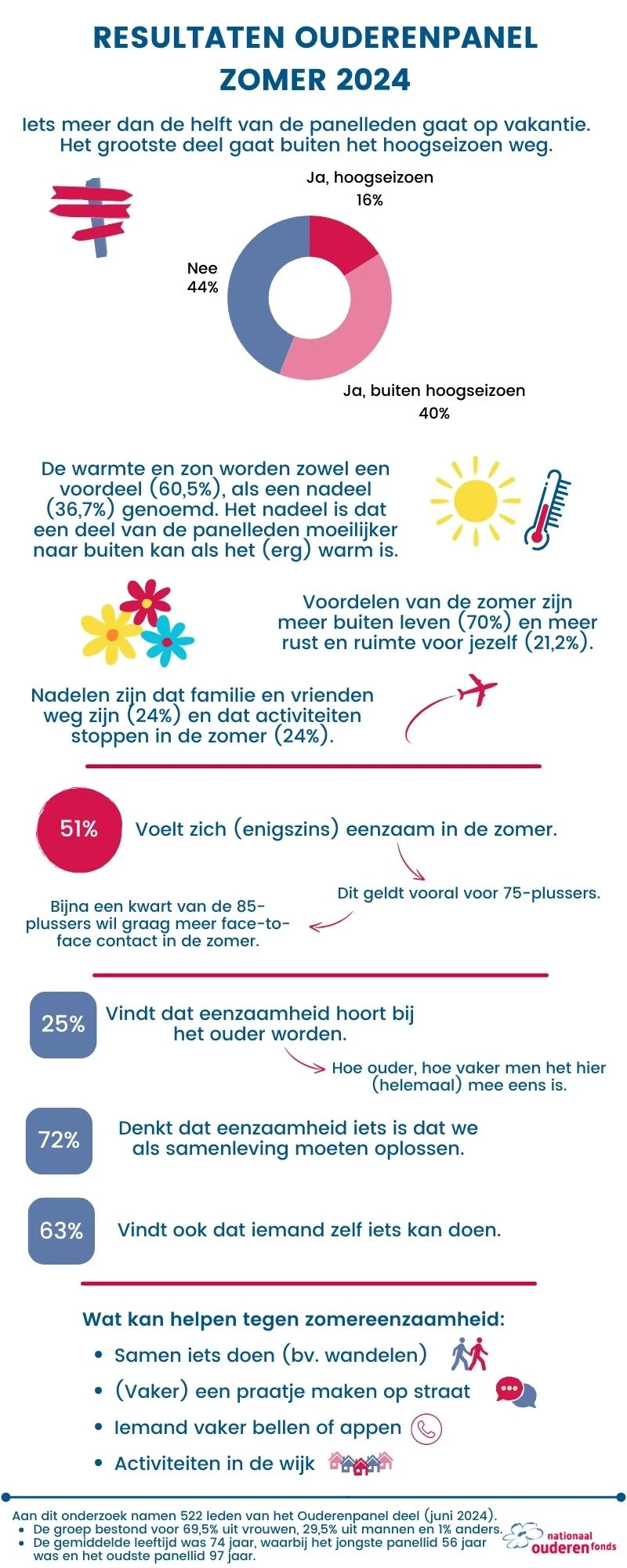 Het lijkt na alle donkere dagen juist alleen maar fijn, de zomer. De respondenten van het Ouderenpanel (55+) zien ook de voordelen van dit seizoen. Meer buiten leven, warmte en zon vinden zij de grootste voordelen van de zomer. Tegelijkertijd zorgt de warmte (of hitte) ervoor dat ruim een derde (bijna 37%) niet of moeilijk naar buiten kan. Ook is het moeilijk dat familieleden op vakantie zijn (ruim 24%), dat activiteiten stoppen in de zomer (23,9%) en dat er minder hulp en zorg beschikbaar is (18,8%). Dan blijft in veel gevallen weinig sociaal contact over.